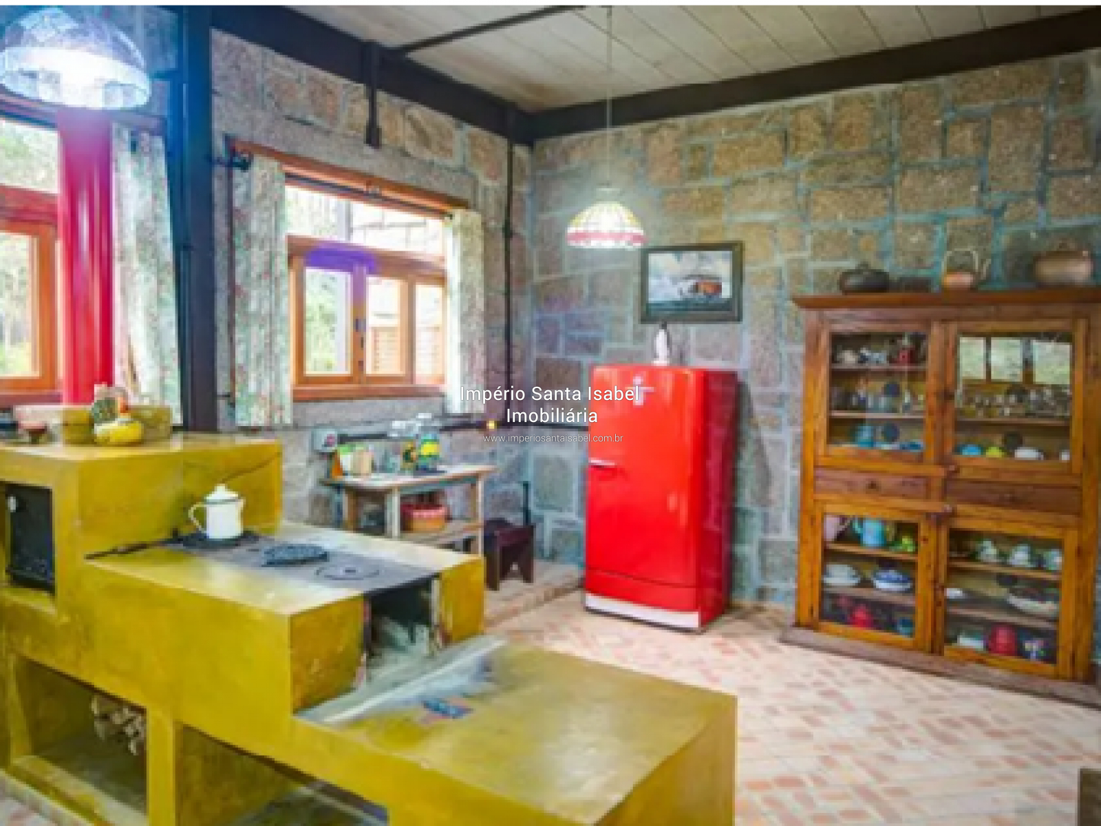 · Cozinha caipira com fogão de lenha, forno, pia, bancadas, fogão industrial – 70m²